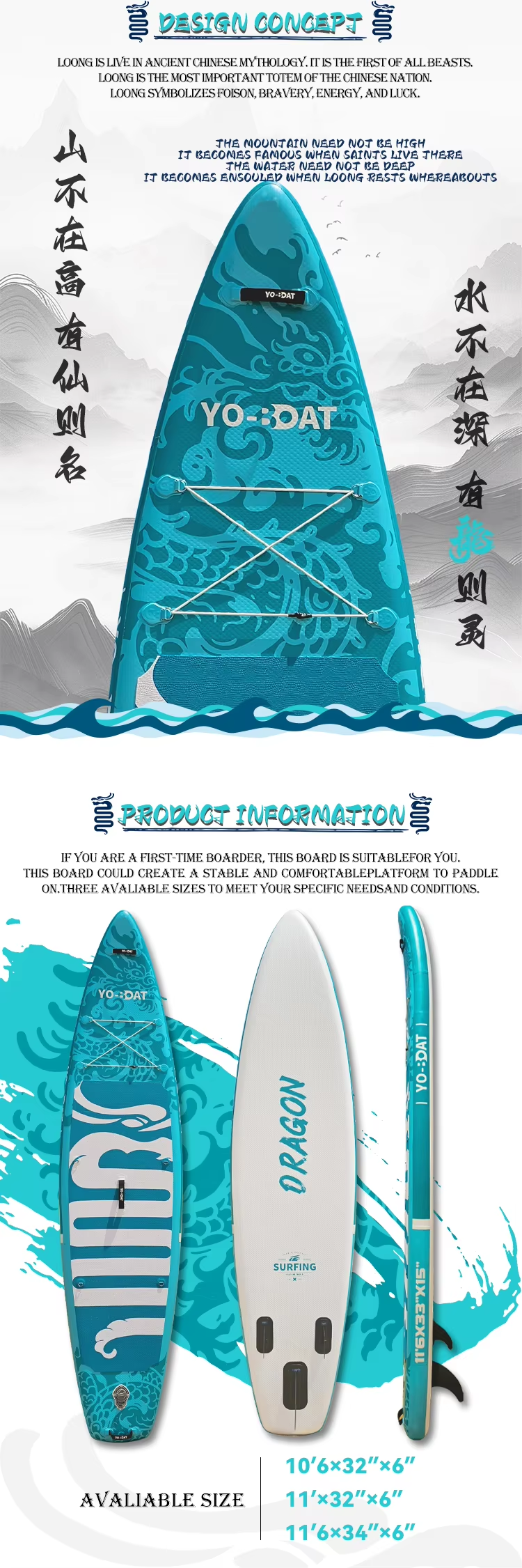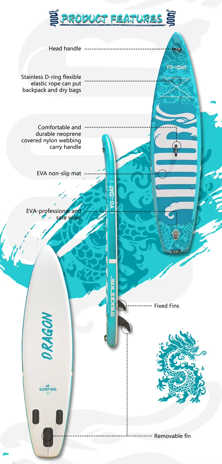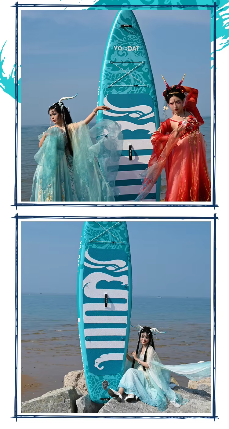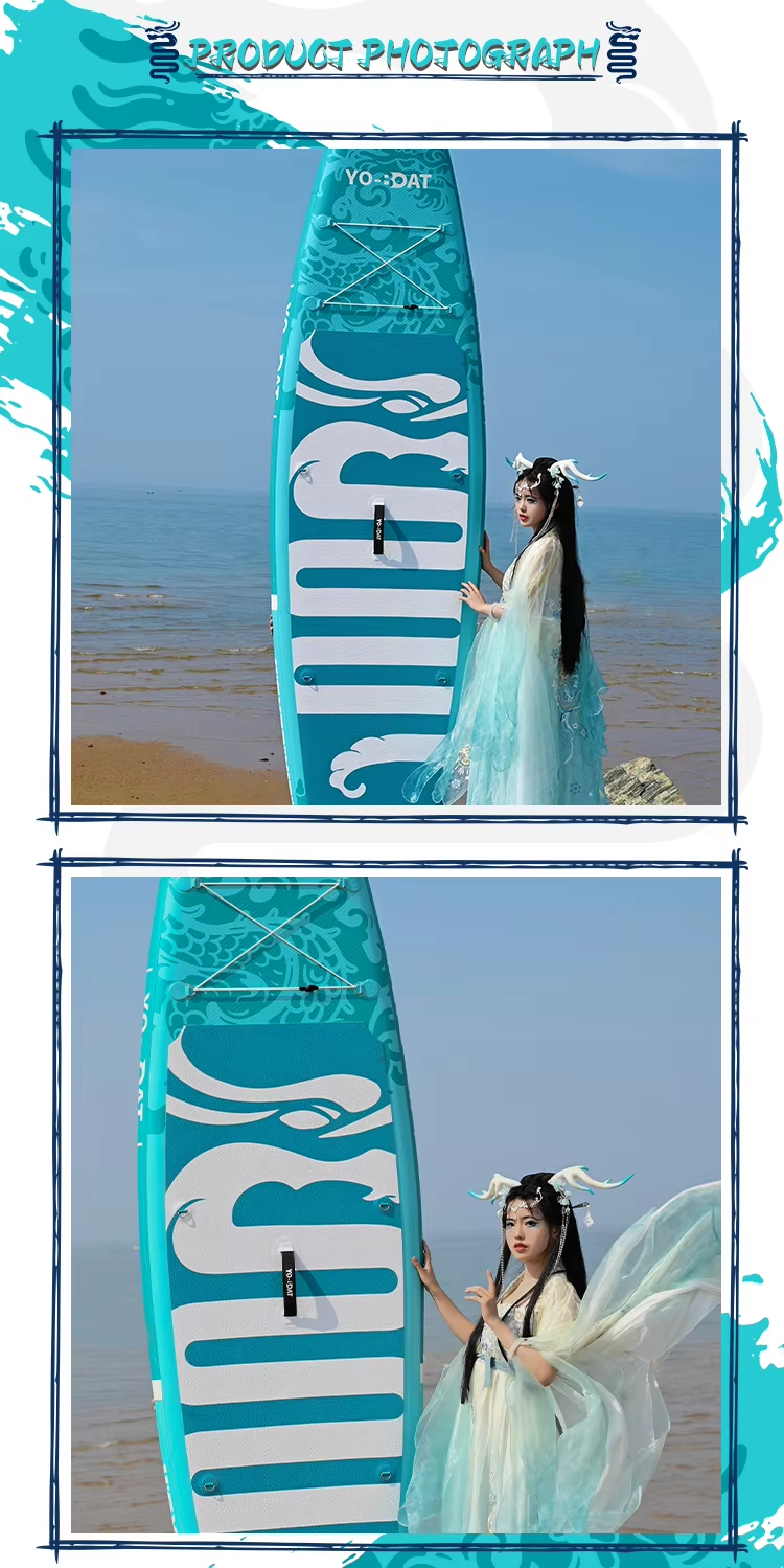 Versatile Design: This inflatable stand-up paddle board is suitable for various occasions, including ocean waters, and is designed for individuals of all skill levels, from beginners to advanced users. Its dimensions can be customize and ensure a stable and comfortable ride.
