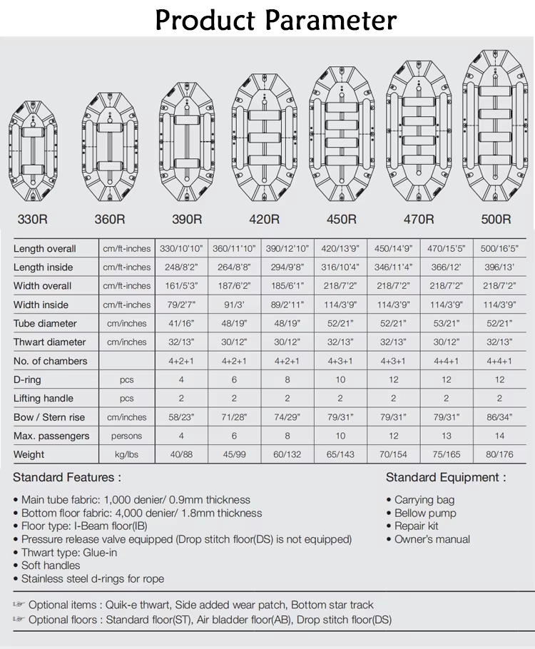 Standard accessories include: 1piece aluminum 3 pieces adjustable paddle + 600D backpack + high pressure double action pump + 1 safety leash + 1piece Repair kit box with glue. We can add or update accessories based on your requirement.