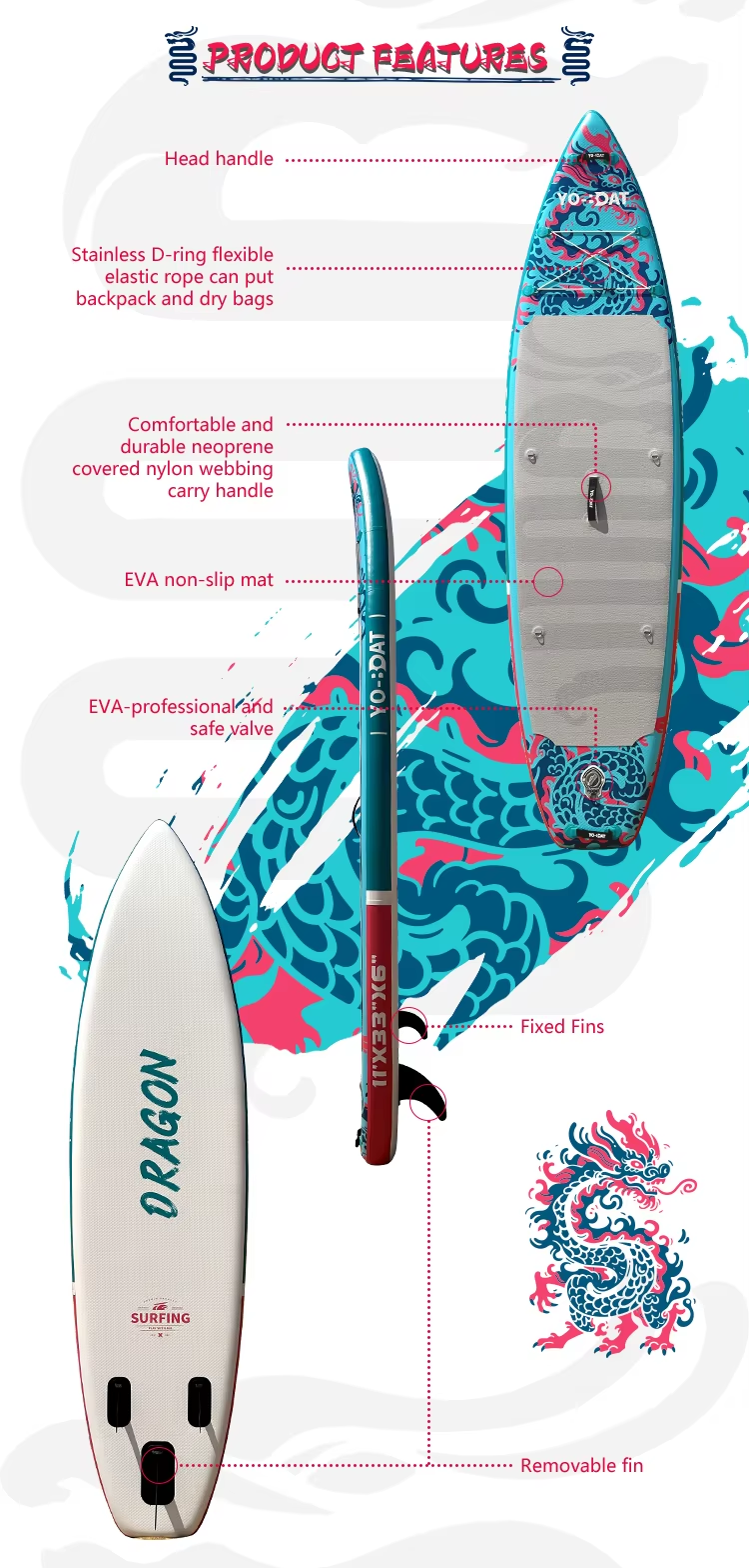 Standard accessories include: 1piece aluminum 3 pieces adjustable paddle + 600D backpack + high pressure double action pump + 1 safety leash + 1piece Repair kit box with glue. We can add or update accessories based on your requirement.
